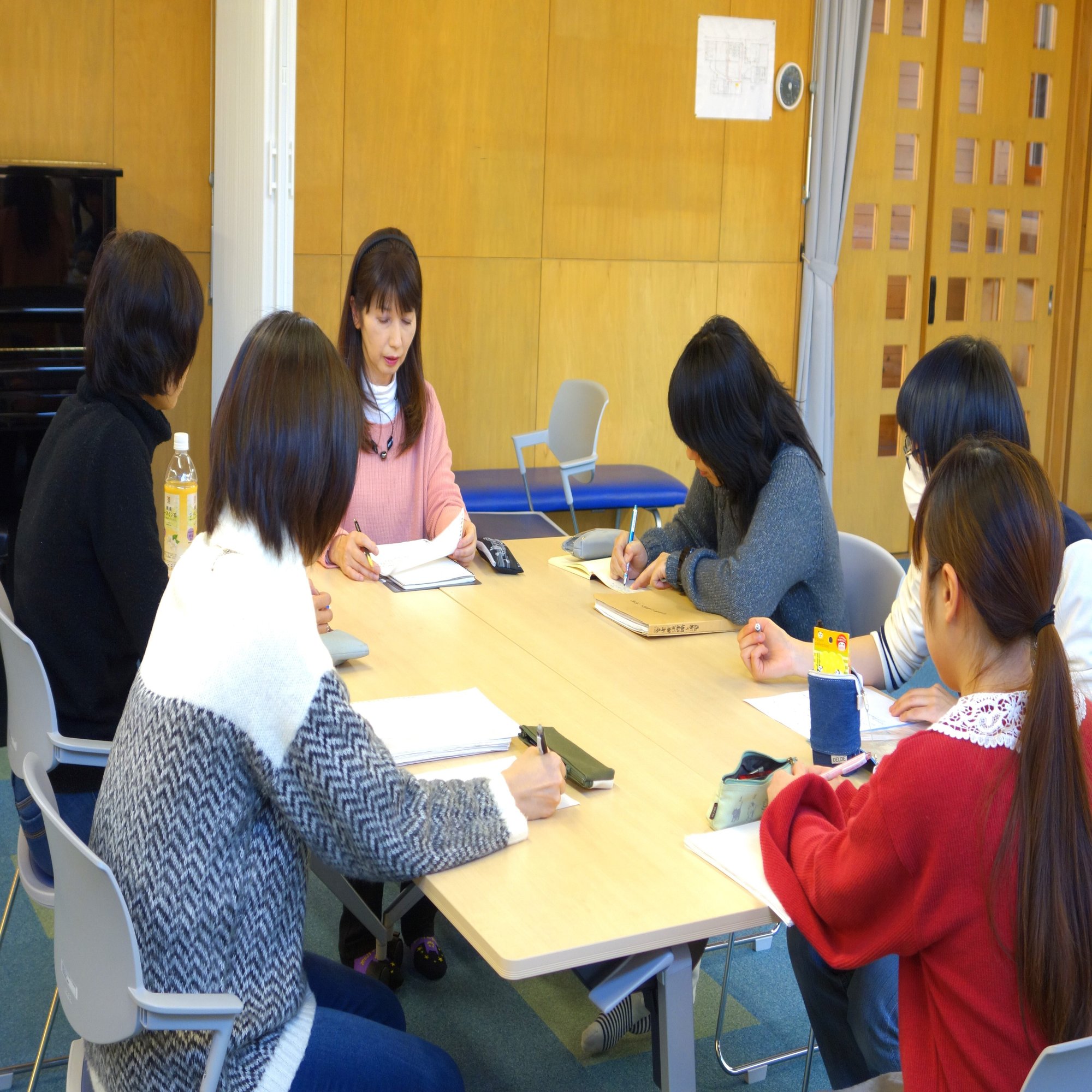 グループセッションは、セラピスト+ピアノ担当+補助担当の3人の連携で行っています。